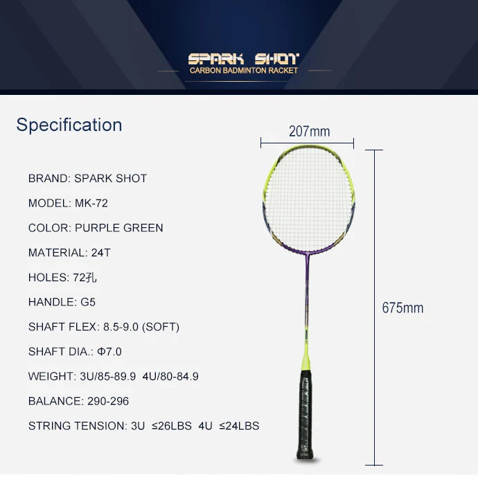 7,0 мм осовина угљен бадминтон рекет мк72 израђује се пуни угљенични материјали. Са пречом осовине од 7,0 мм. То је за професионални плејер.